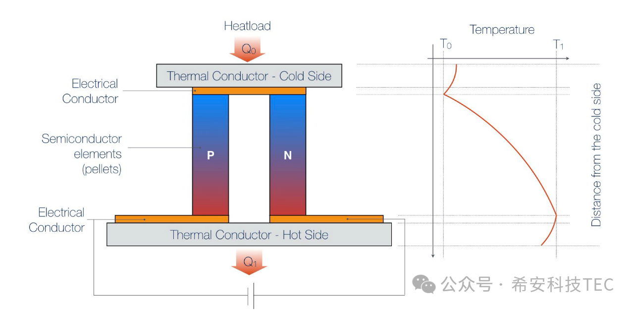 Termiske ledere legges til i begge ender av termoelementet som vist i følgende figur: en komplett TEC dannes. Når TEC er drevet, vil den øvre overflaten absorbere varme, som kalles den kalde enden, og den absorberte varmen er Q0. Den nedre overflaten avgir varme og kalles den varme overflaten, hvor varmen som frigjøres er Q1 ; Q1= Q0+Qtec