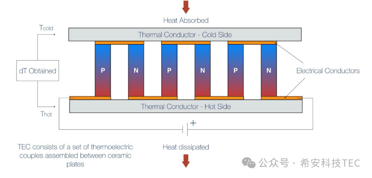PN-krysset, gjennom det ledende laget, danner et termoelement og er den strukturelle kjernekomponenten i TEC. Et enkelt par termoelementer kan også oppnå funksjonene kjøling eller oppvarming etter å ha blitt slått på.